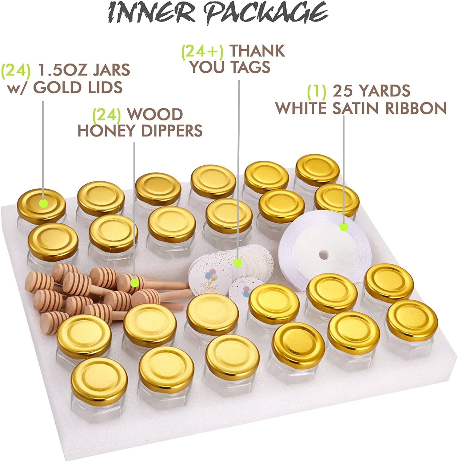 24 Pack Gold White Theme Party Favors 1 5oz Mini Honey Jars W Gold Lids Wood Dippers Tags Satin Ribbons Takehome Gifts For Guests In Baby Shower Wedding Birthday Gold 24 Walmart Com
